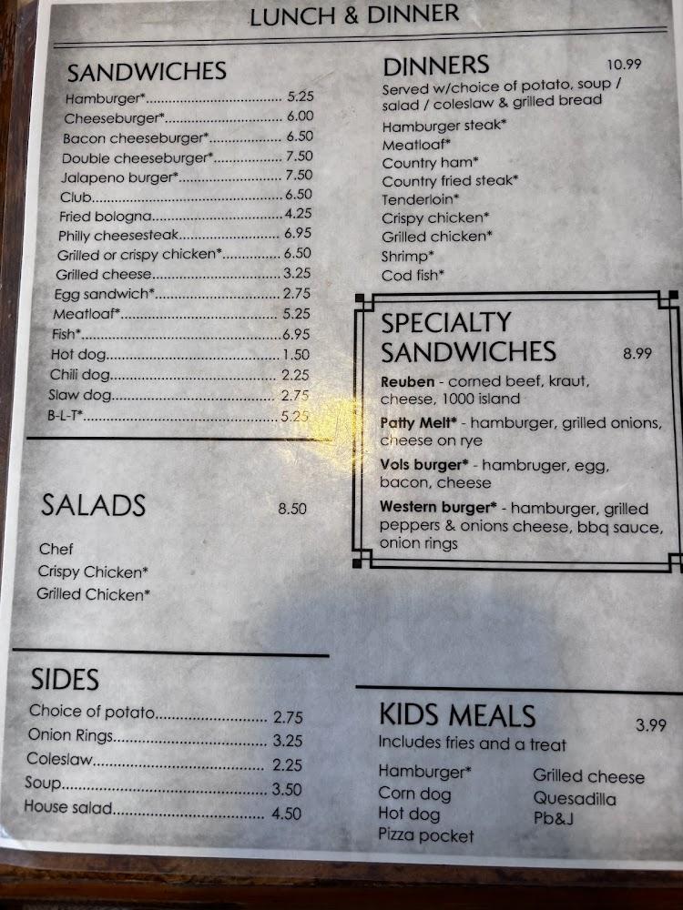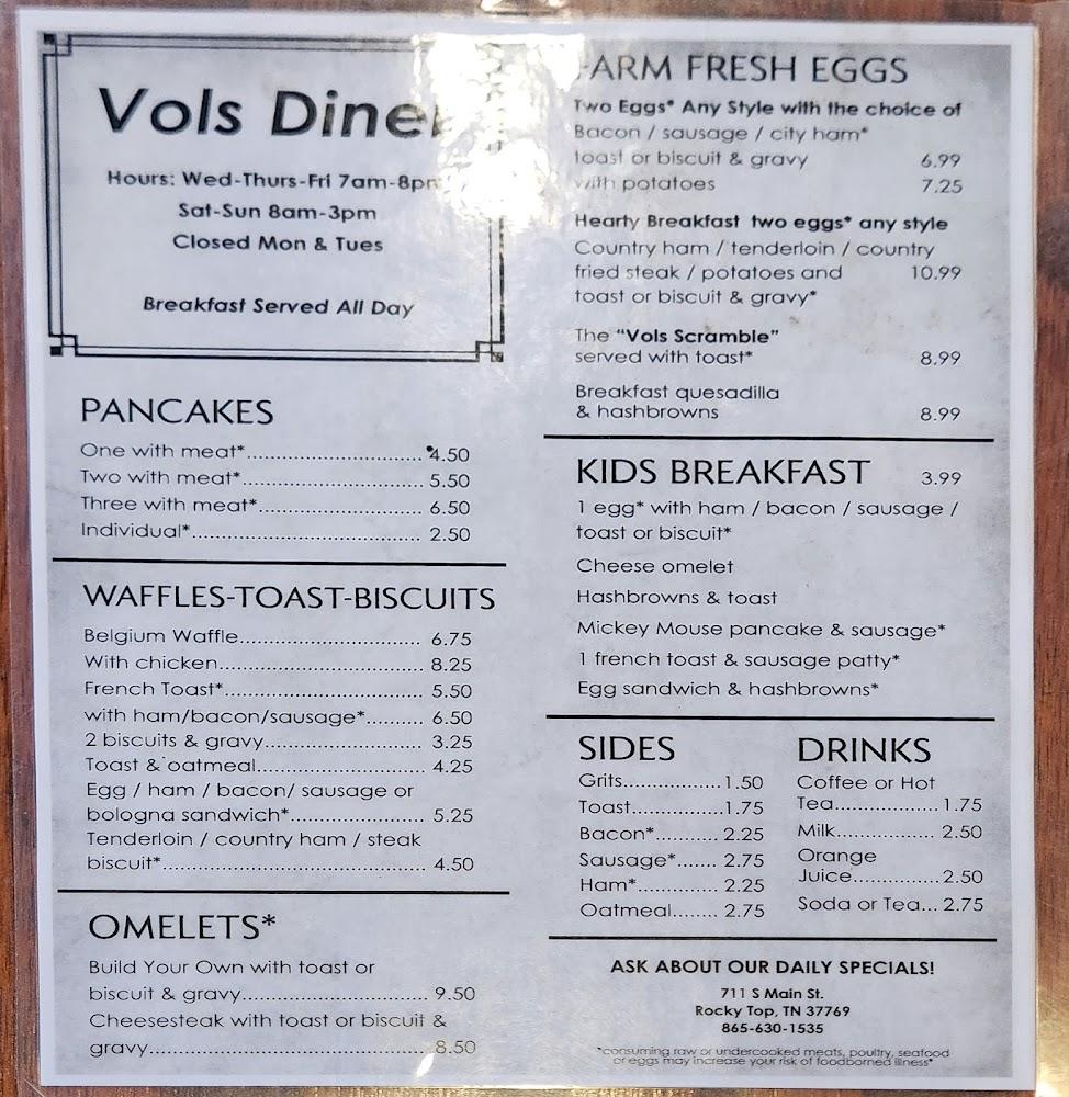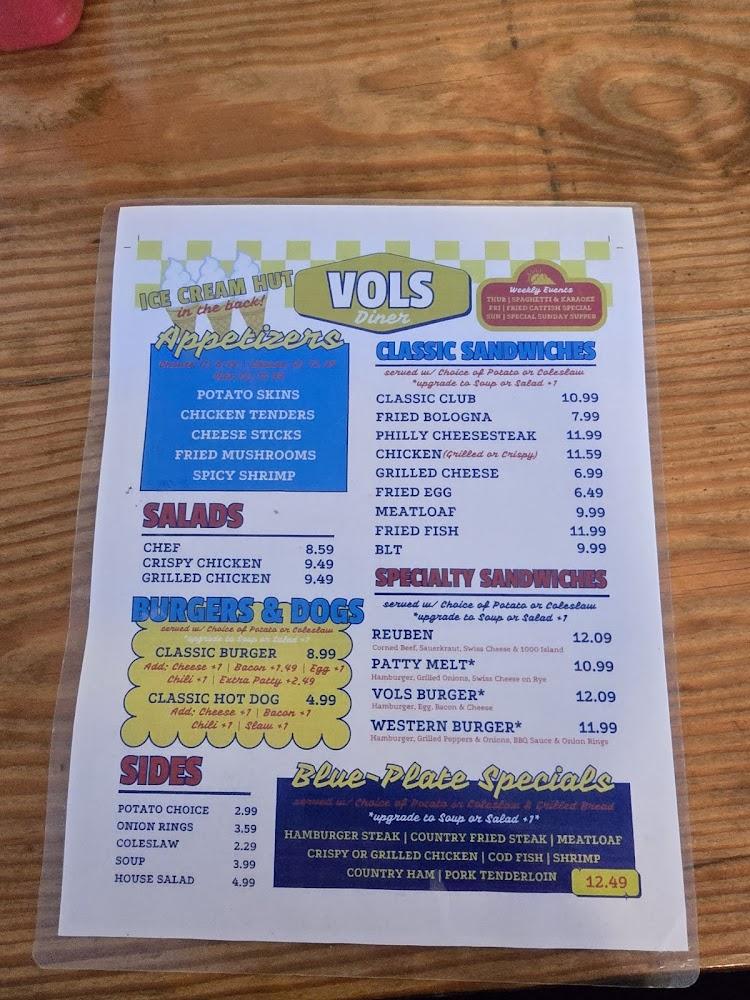 Lil Vols Diner offers a diverse menu focusing on classic breakfast and diner staples. Breakfast items like homemade biscuits, fluffy pancakes, and scrumptious omelets dominate the menu. Lunch and dinner options include sandwiches, burgers, and hearty dinners like meatloaf and country fried steak.